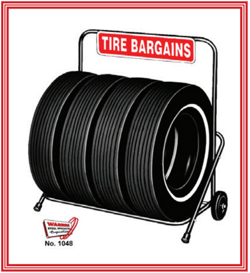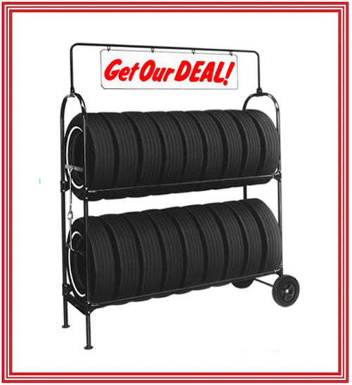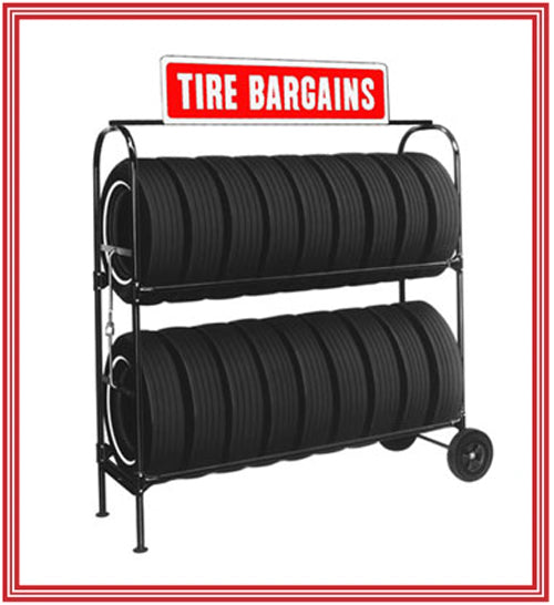 - Heavy-duty 6” rubber-tired wheels and includes your choice of: “Get Our Deal!” or “TIRE BARGAINS”sign in red/white or blue/white.